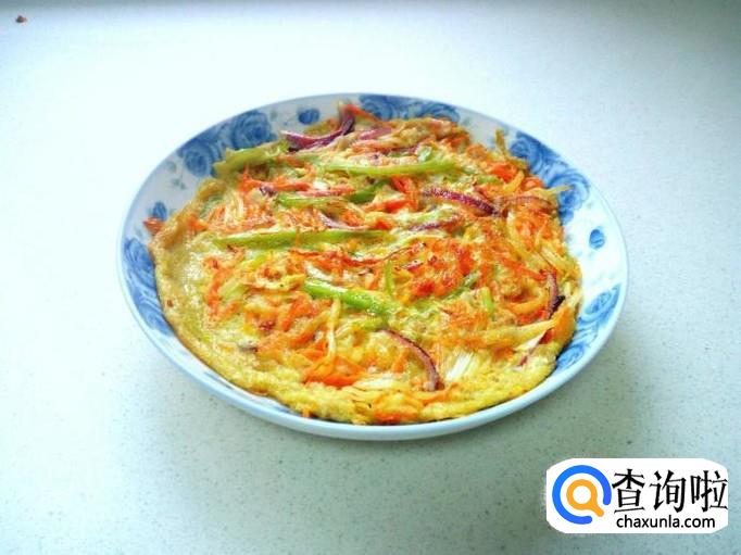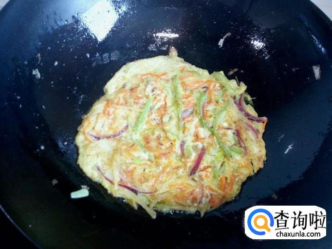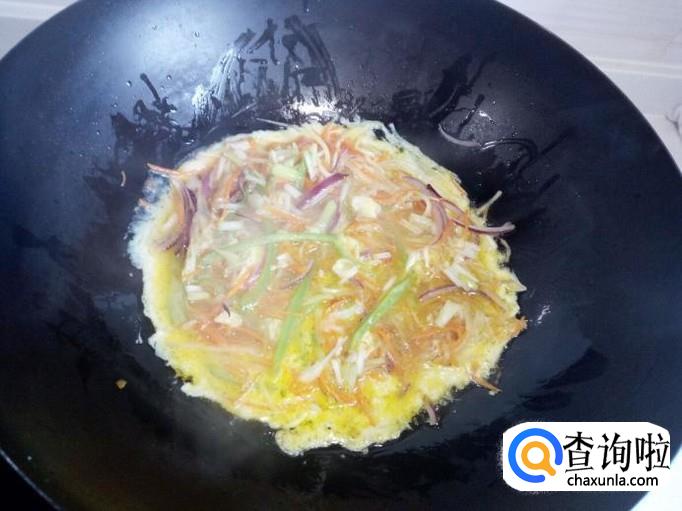煎塌至圆葱,青尖椒丝变软后,把煎塌变软的土豆,胡萝卜,圆葱,青尖椒丝,均匀摊开,然后倒入调和好的鸡蛋液小火煎塌。