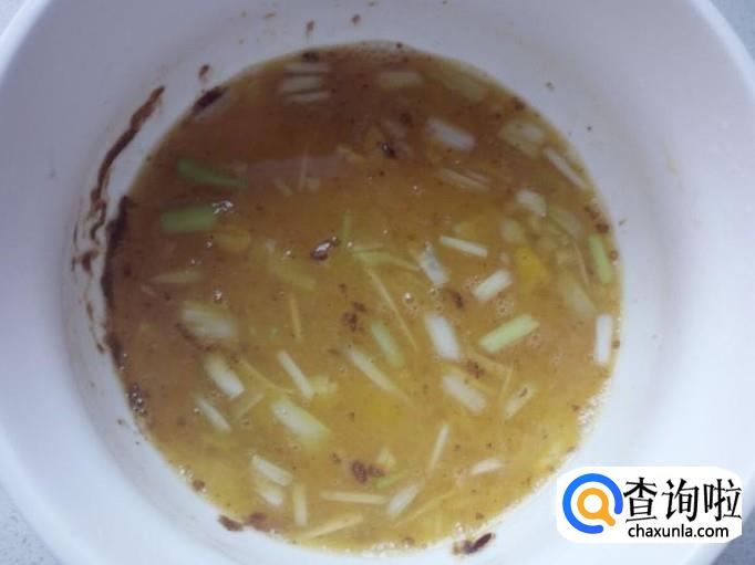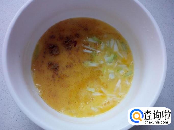 把切好的葱,姜,放入搅拌好的鸡蛋液碗中。放入五香粉,盐,味精(根据个人的喜好,掌握放入调料的量),拌和均匀。