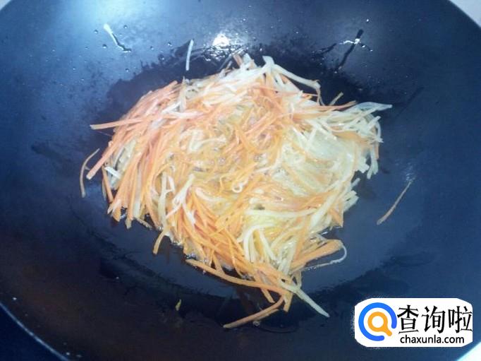 锅内放入油加热,油六,七成热时,放入土豆丝,胡萝卜丝小火煎塌(可以稍翻炒)。