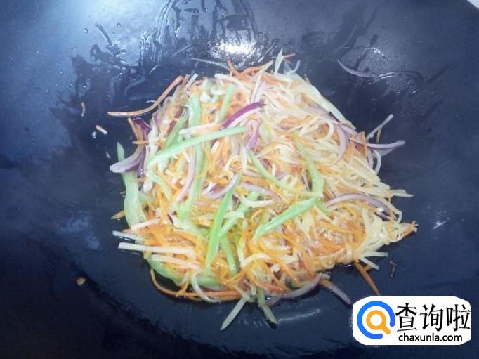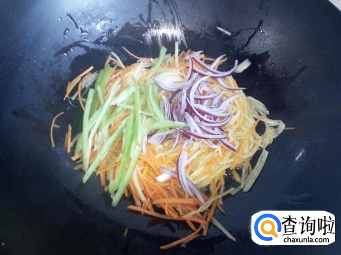 煎塌至土豆丝,胡萝卜丝变软,放入圆葱,青尖椒丝,煎塌。