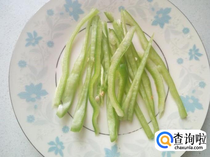 青尖椒用水清洗干净,控干水分,切成丝。切好葱,姜备用。