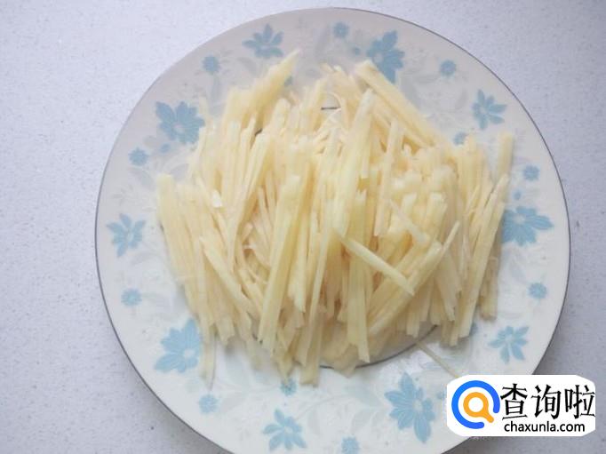 土豆去皮,用水清洗干净,控干水分,切成丝。不用放入水中浸泡,因为土豆含有淀粉成分,在煎塌的时候,容易粘粘在一起,正好适合煎塌饼。