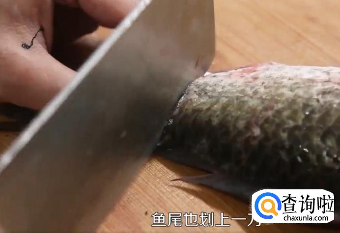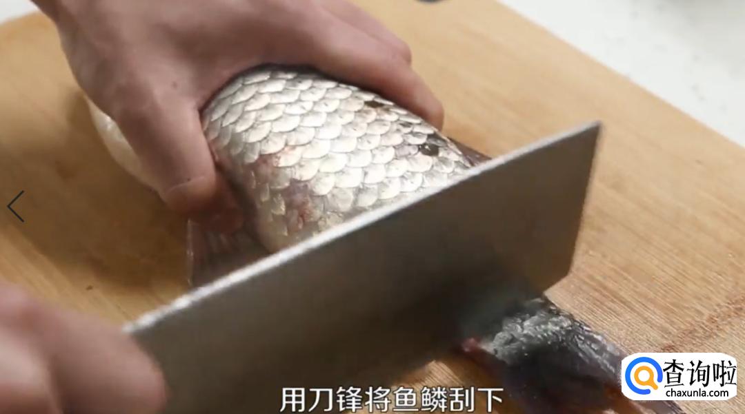 用刀锋逆向去鳞片。提示:去鳞时,注意别被刀锋伤到手。