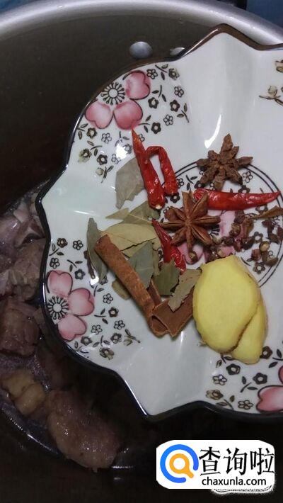 准备适量生姜切片儿,然后准备适量的香叶,八角,桂皮,花椒,干辣椒放入高压锅中。