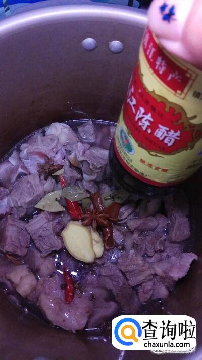 牛腩块适量,生姜适量,八角适量,桂皮适量,香叶适量,花椒适量,干辣椒适量,料酒适量,陈醋适量,老抽适量,白砂糖适量,盐适量。