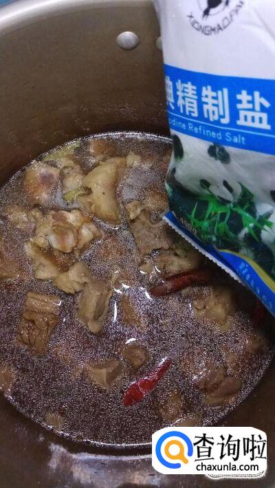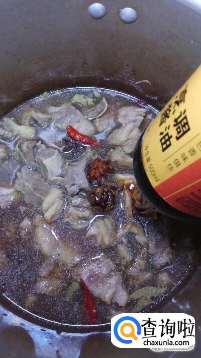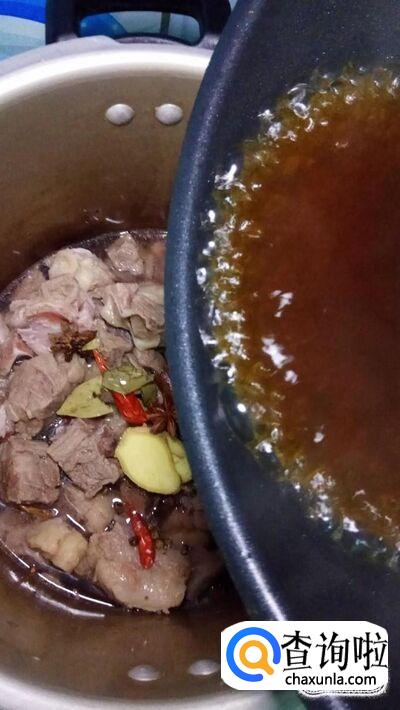 将糖汁倒入高压锅中,然后再加入少许老抽,放入适量食盐。