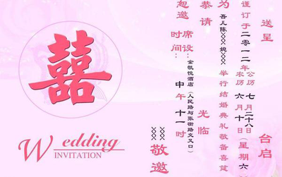 结婚请柬书写格式封面写明“请柬”二字,帖文首行顶格书写被邀请者的姓名或被邀请单位的名称。然后正文写参加活动的内容,结尾,时间等。