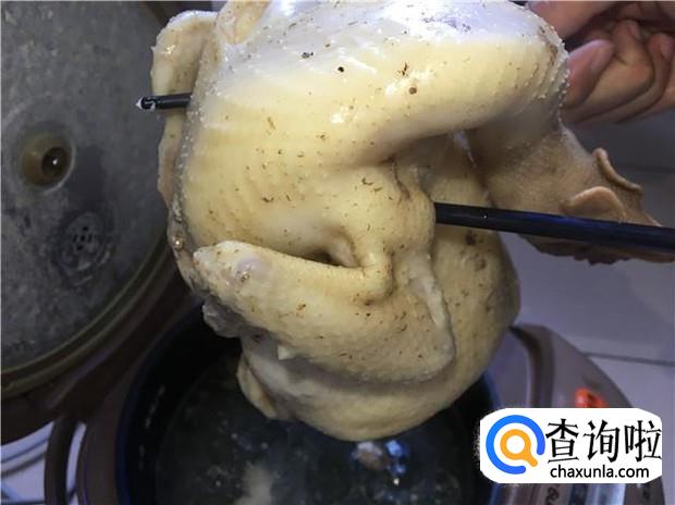 大概煮10分钟左右,就要吊一次鸡了,目的就是把鸡肚子里面的水给更换一次,这个步骤很重要的哦,用筷子夹住鸡的两边翅膀,然后把鸡肚子里面的水给倒出来,然后再把鸡放入锅中煮,这样整个鸡就可以均匀受热了。