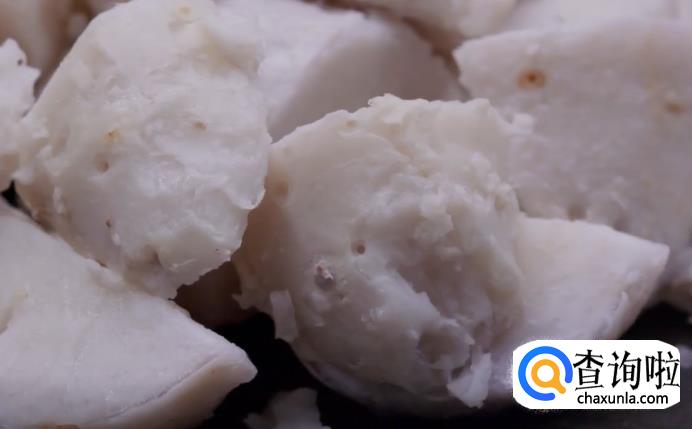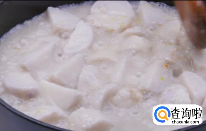 开大火煮沸后转小火,大约煮15分钟,可以用筷子试试软硬程度,能够戳穿即可捞出。捞出后放入凉水中降温。芋艿凉后,将皮剥去,切成大块备用。