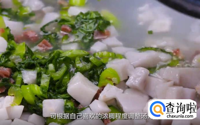 然后,热锅起油,先放火腿煸炒出油,再加入青菜,炒至五分熟,接着放入芋艿和煮芋艿的汤汁,可以根据自己喜欢的浓稠度来调整汤汁的比重。