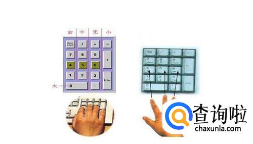 在基准键位基础上,小键盘左侧自上而下的“7, 4, l”三键由食指负责。同理中指负责“8, 5, 2”,无名指负责“9,6,3”和“.”。