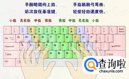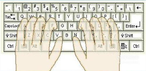 首先将手指放在键盘上,如下图,手指放在八个基本键(左手ASDF,右手JKL;)上,两个母指轻放在空格键上。正确放置手指位置是最基本的,也是最重要的。