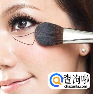 在眼下用高光笔画一个三角形,然后用修容刷拍开,记住要拍开,直接刷会破坏眼下遮瑕。