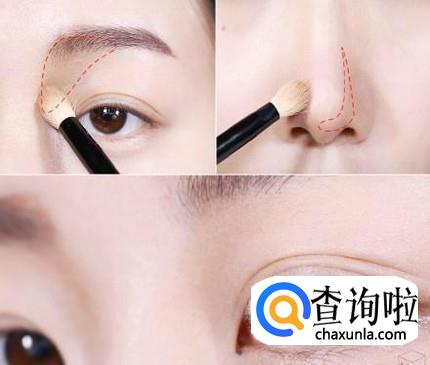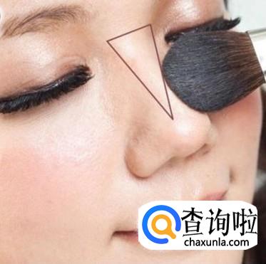 从眉毛下面沿着鼻梁两侧用修容笔的阴影笔画“1”,然后用刚才用过的修容刷刷开。