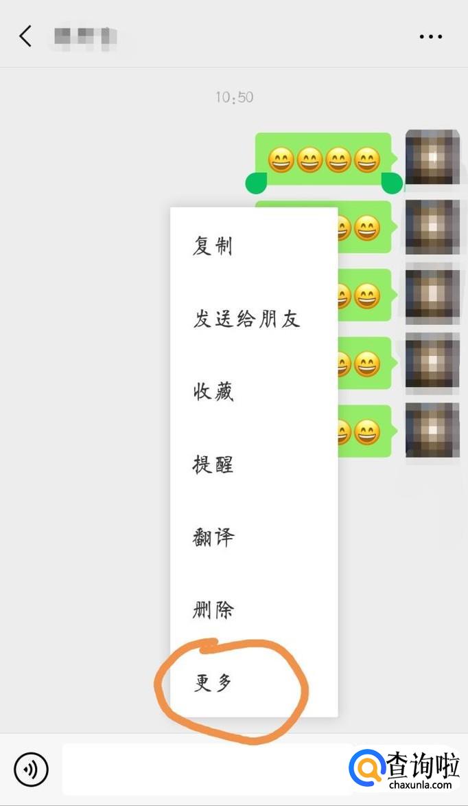 首先选择一条自己要转发的聊天记录长按,在出现的菜单中选择“更多”