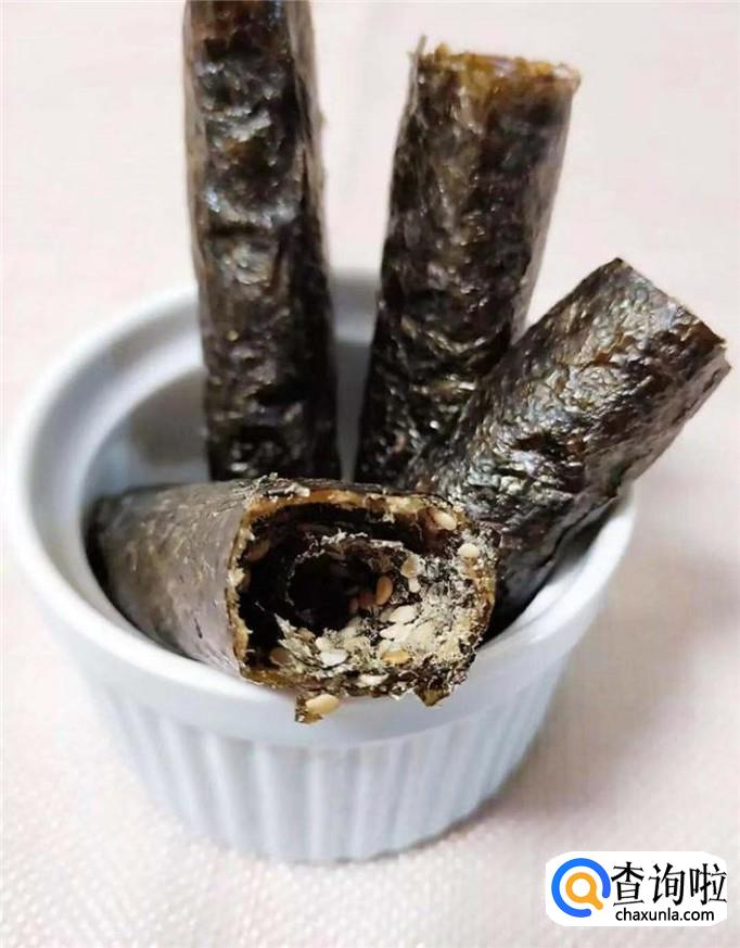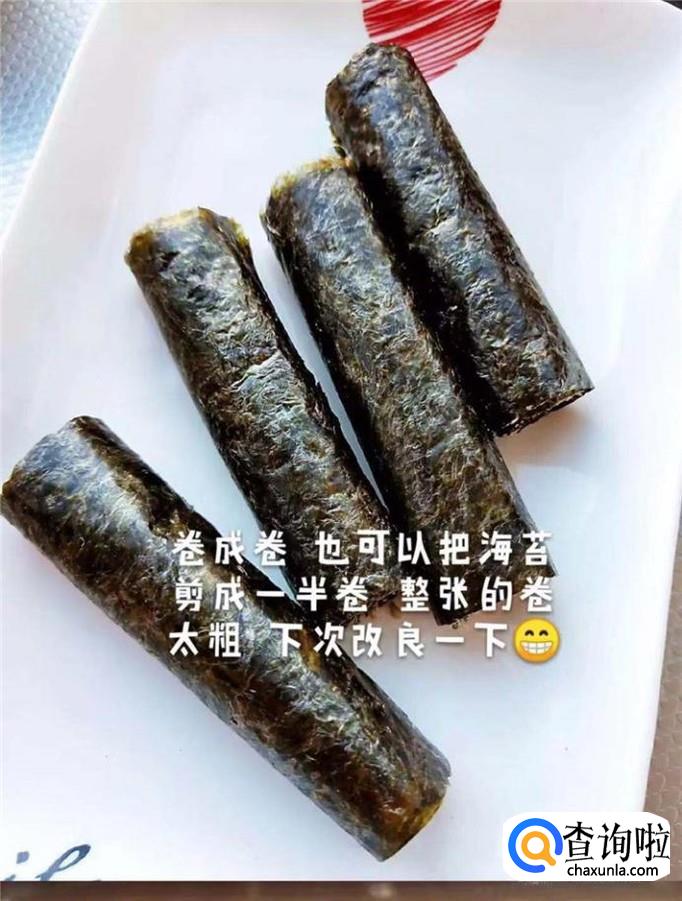 接着将肉松芝麻海苔卷起来,如下图所示。小贴士:大家可以根据自己的喜好,将海苔剪成我们喜欢的大小。