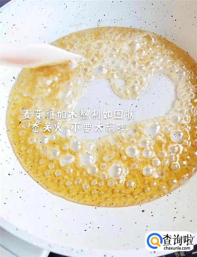 然后将麦芽糖和水倒入锅中熬成起大泡,如下图所示。