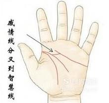 女性有很多条支线由感情线伸至智慧线,表示谈恋爱问题多,不仅伤身,连社会名誉也受损,像会与有妇之夫谈恋爱,也就是“小三”一族都属此型。此外,金星线出现岛状,表示恋爱或结婚经常会起冲突。