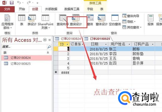 然后点击顶部的创建菜单,选择下面的查询设计选项,如下图所示