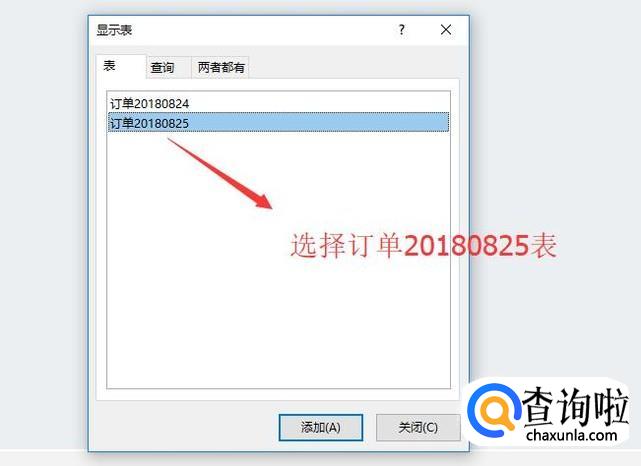 在弹出的显示表界面中选择第二个数据表,如下图所示,接下来会将选择的表合并到第一个表中