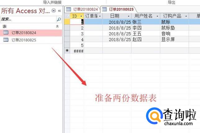 打开Access软件,新建两个数据表,注意两个数据表的字段需要相同,数据不同,如下图所示