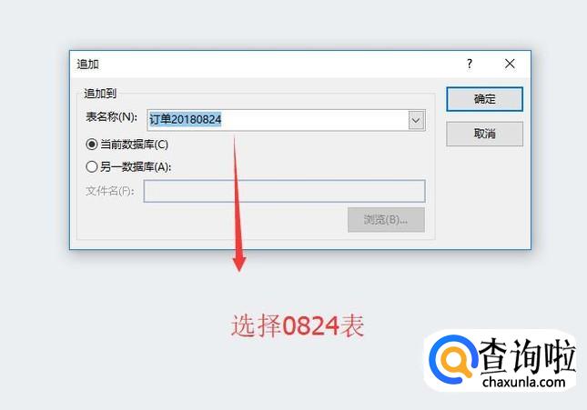 在弹出的追加界面中选择第一个表,然后下面勾选当前数据库选项,如下图所示