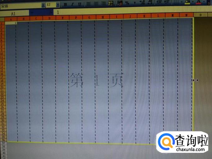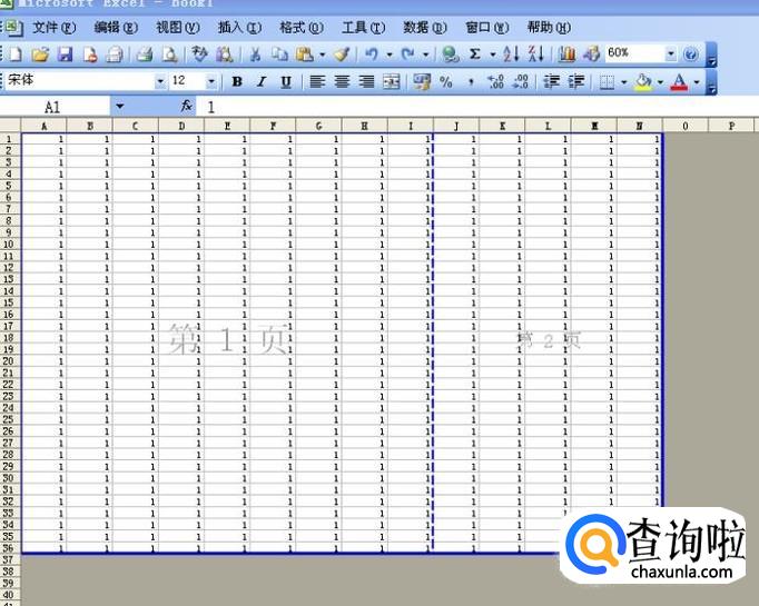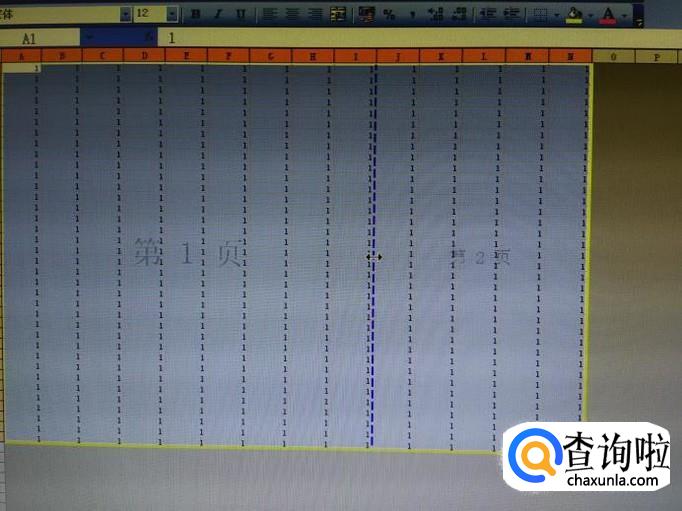 点击分页预览后,我们看到需要打印的部分显示出第1页和第2页,我们把光标放在第1页和第2页之间的虚线上面,这时,光标就变成了双箭头,我们只需把箭头拉到右侧的黄线处,两页就变成一页了。