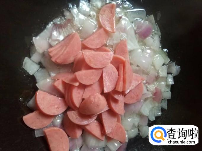 之后放入火腿肠,这时候开小火,将它煸炒两分钟,更能提味。