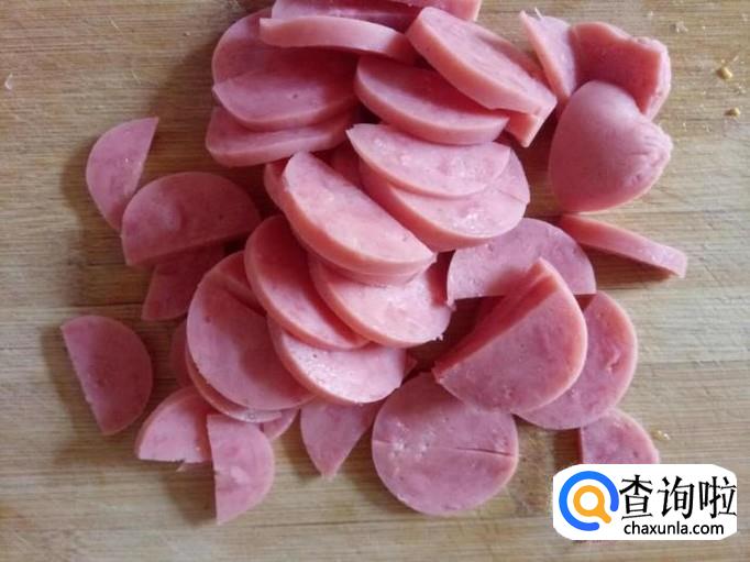 火腿肠一根,也将它切成一厘米左右厚度的半圆状,喜欢吃的话可以多放,根据个人口味。