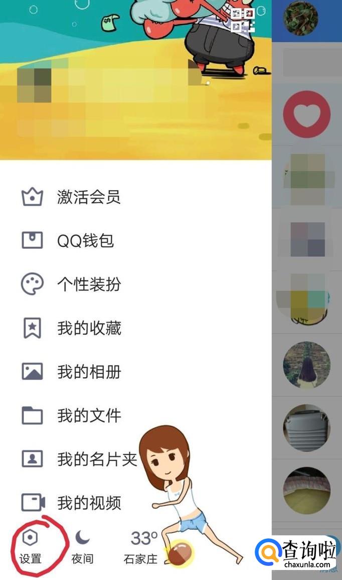 打开手机QQ,向右滑动,点击左下角的设置,如下图所示。