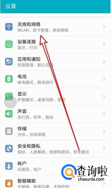 在设置中,选择无线和网络的选项