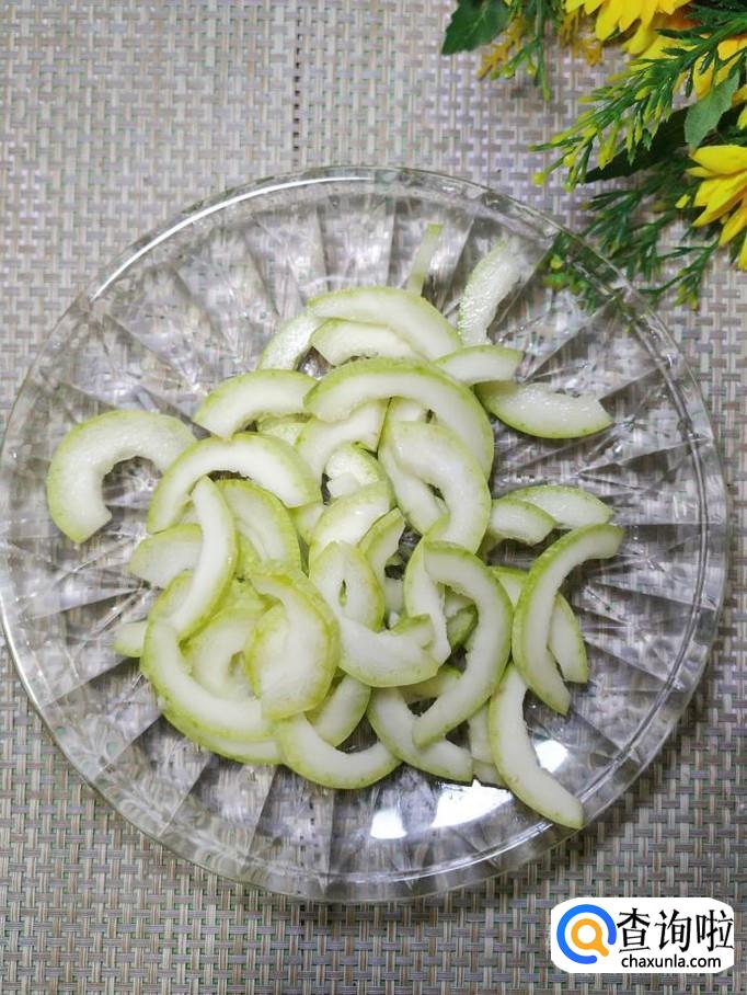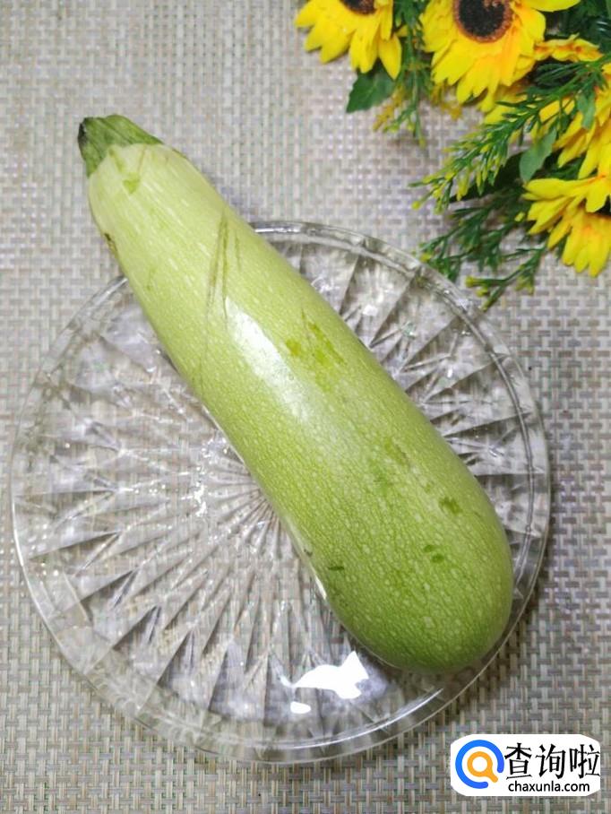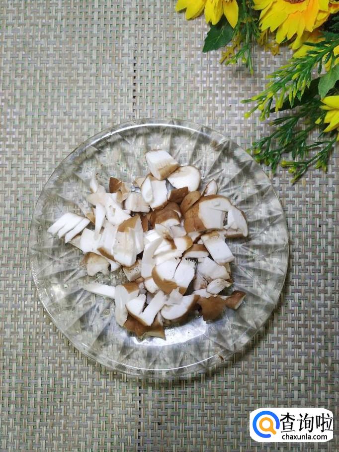 准备适量西葫芦,洗净后,去除内瓤,切成片,放入盘中备用,再准备适量香菇,洗净后,切成丁,放入盘中备用。