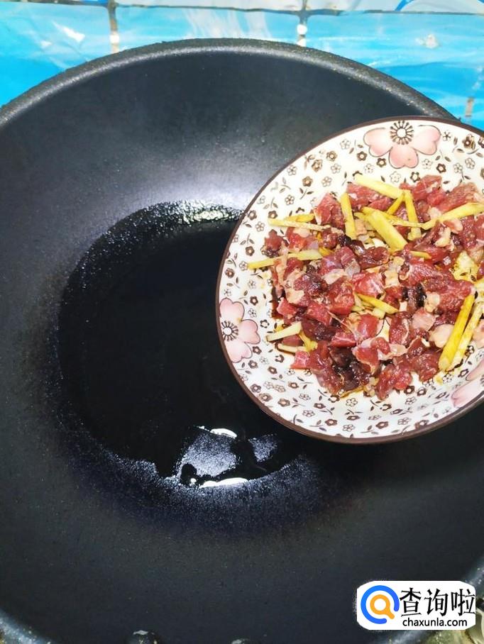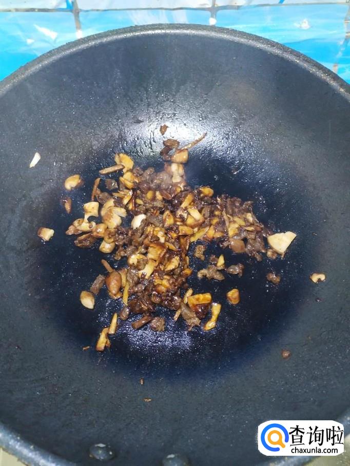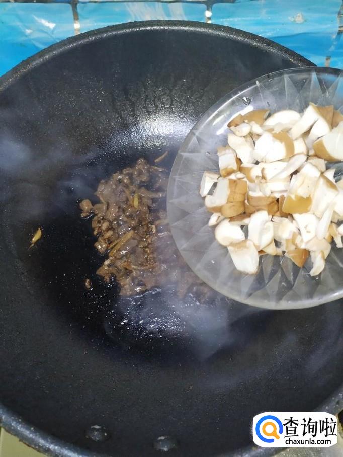 炒锅中放入适量油,油热后,将牛肉放入锅中炒一下,大约炒两分钟左右,将香菇块倒入锅中,和牛肉一起翻炒均匀。