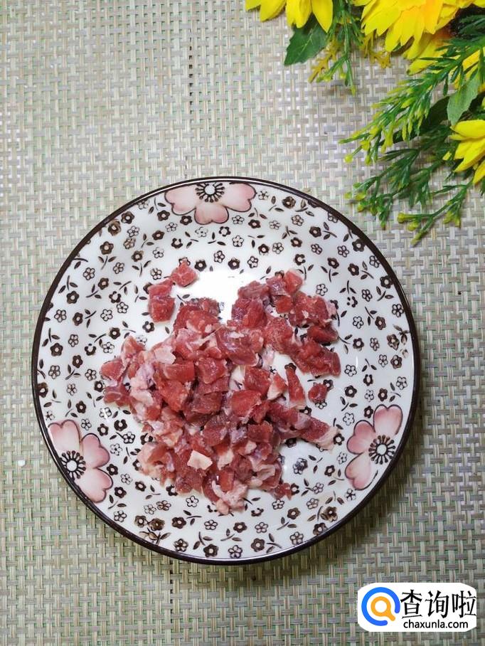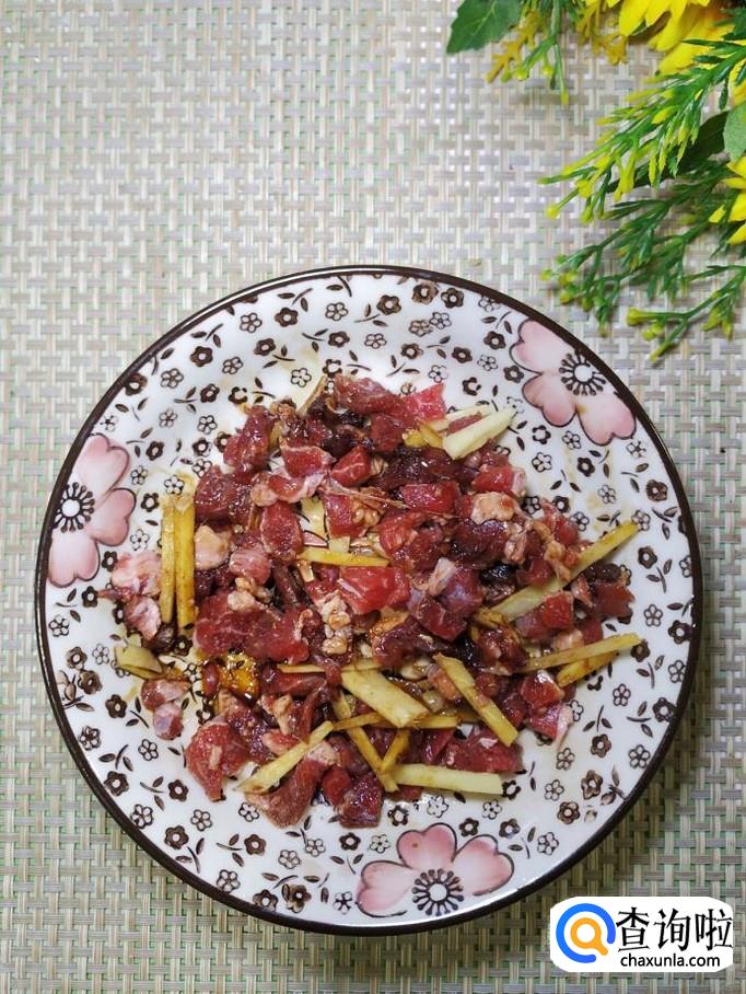 准备适量牛肉,洗净后切成小丁,再准备适量姜,洗净后切成丝放入盘中,加入适量盐,鸡精,五香粉,生抽,料酒搅拌均匀,腌制十分钟以上。