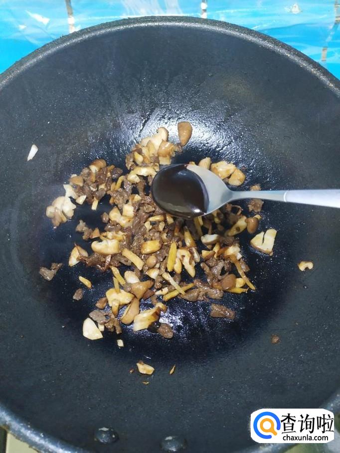 加入一勺甜面酱,炒出香味儿,这个时候可以看到牛肉和香菇的色泽,更加漂亮了。