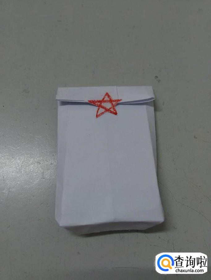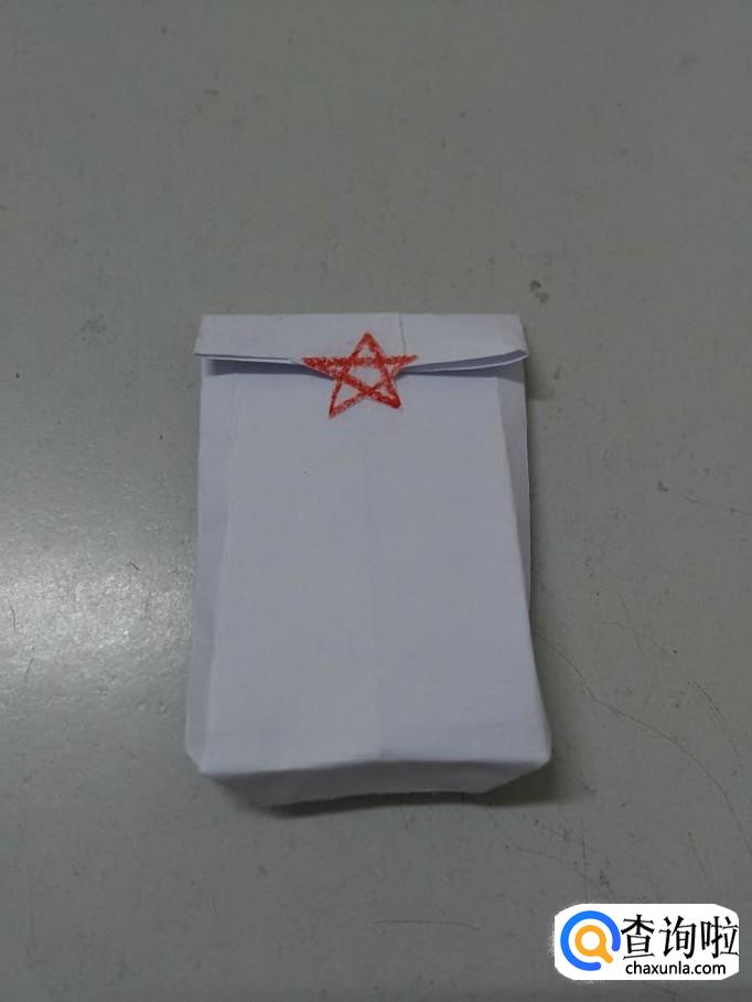 用剪刀把五角星剪下来,把袋子口往下折一段,把五角星背面抹上胶,粘在袋口处封好,盲袋就做好了。