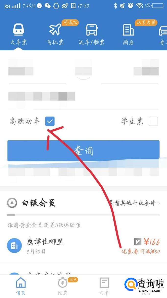 在如图1框框所示的区域输入你的出发地点和目的地还有出发时间。在如图2箭头所示的地方勾选高铁动车。