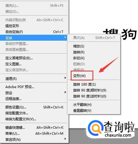 选择文字将文字栅格化,然后再在编辑菜单那里找到变换选项,点击该选项在其内找到变形选项,如图所示: