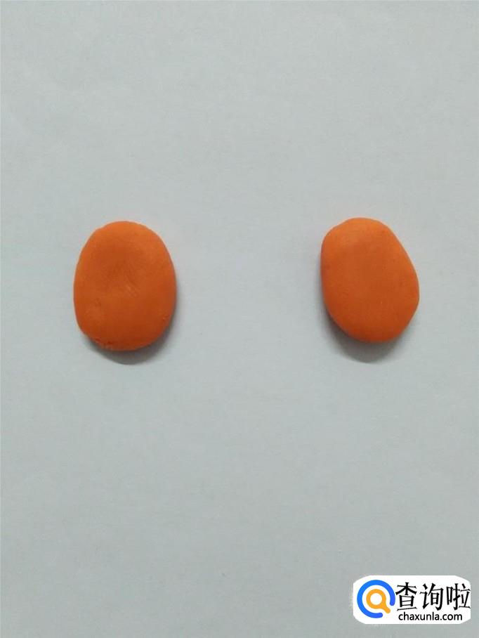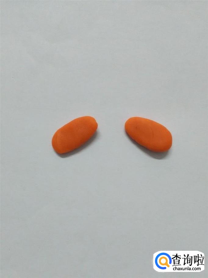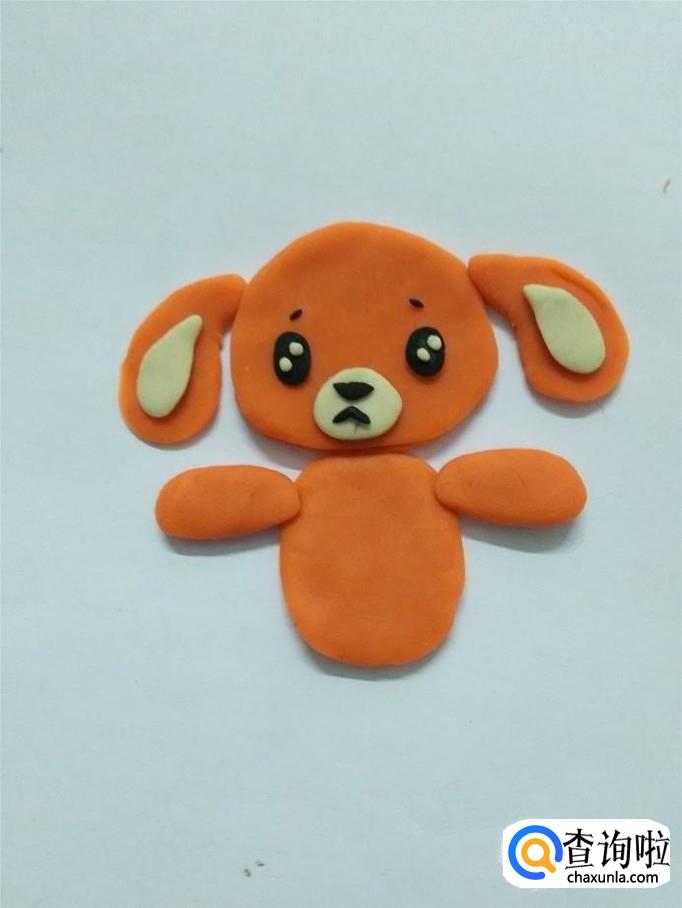 用两块桔红色捏成两个窄一些的椭圆形,粘在小狗身体左上方和右上方,当作小狗的两条前腿。