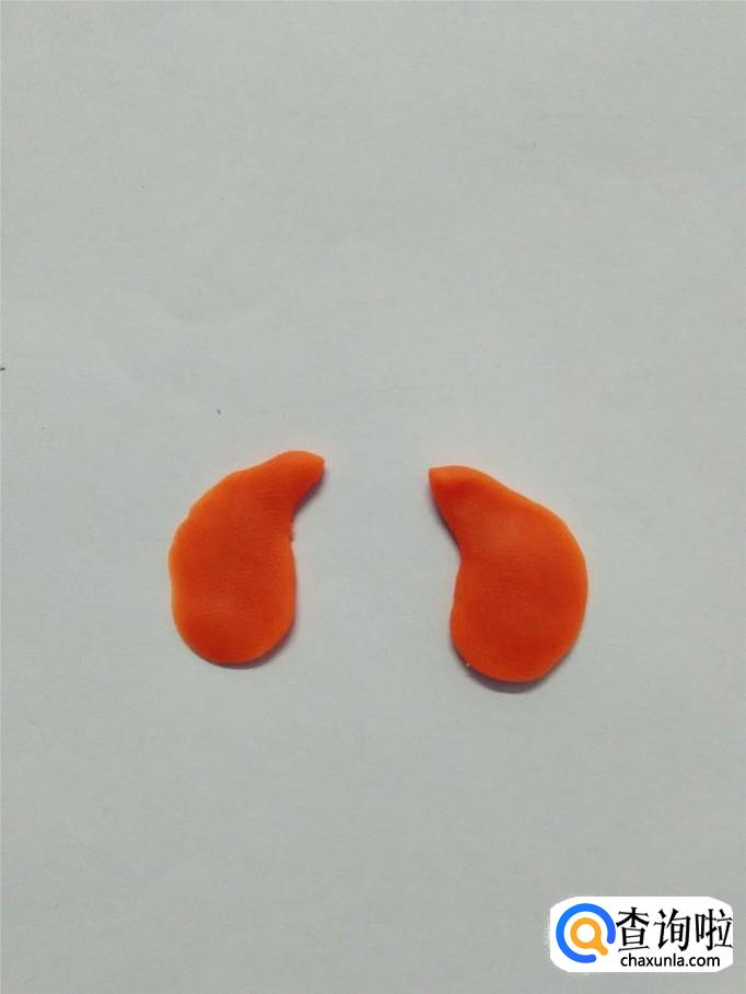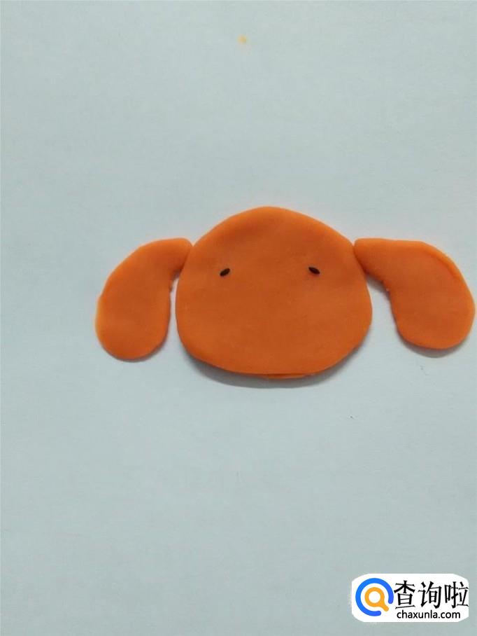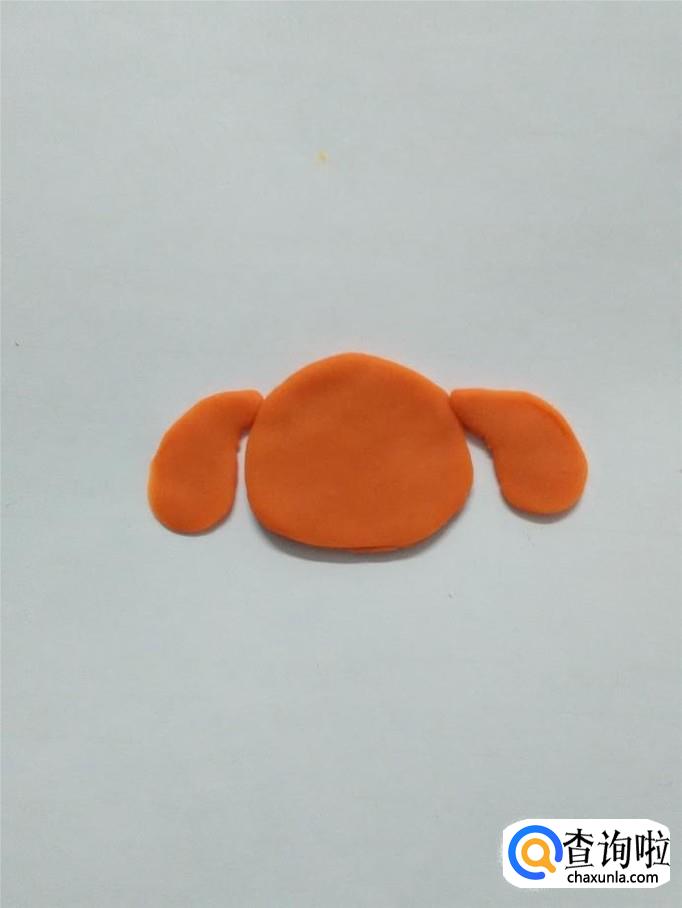 再用两块桔红色捏成两个弯弯的水滴形状,粘在小狗头部两侧,当作小狗的耳朵。