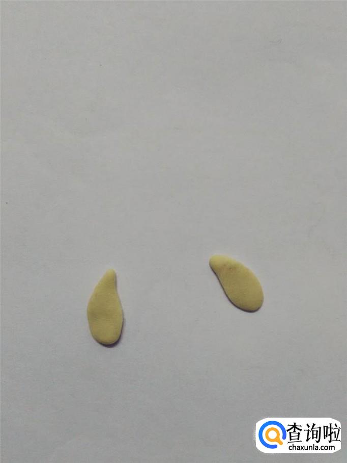 用两块白色捏成两个水滴形状,粘在小狗的两只耳朵上面,当作耳朵里的白毛。