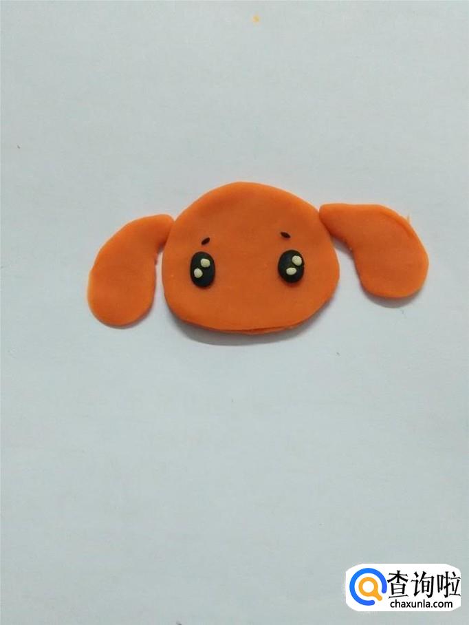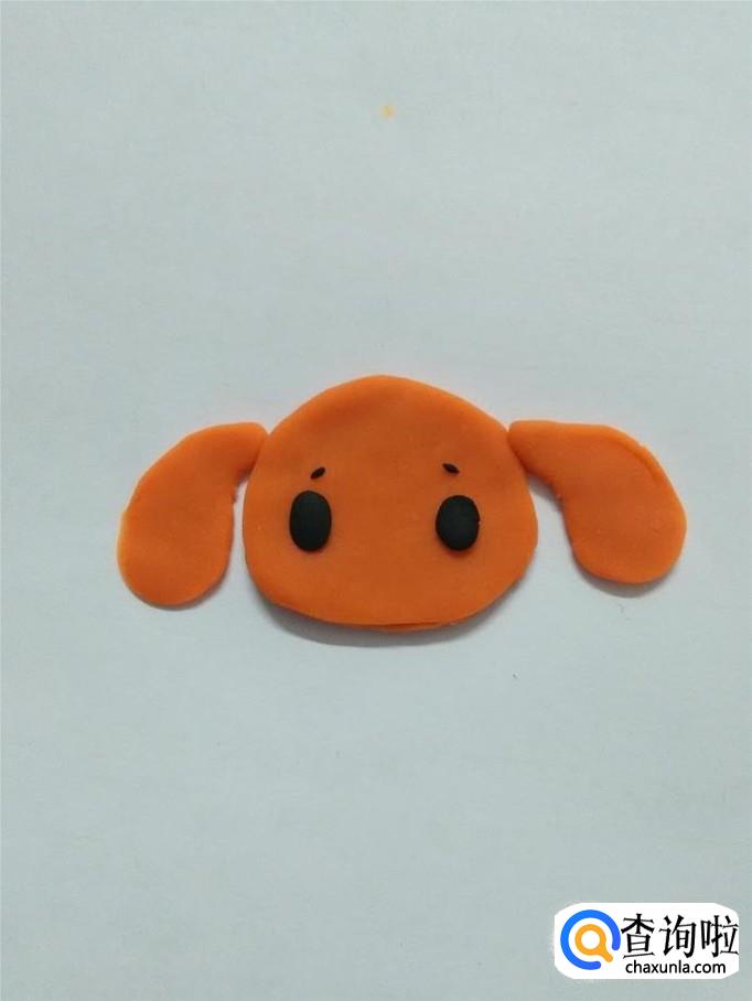 用两块黑色捏成两个椭圆形,把椭圆形竖着粘在小狗的眉毛下面,当作小狗的眼睛。