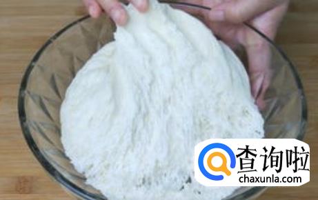 面粉醒发:发酵的时间也就2小时左右,这时你可以用手在面粉上戳一下,如果出现了一个洞,那就说明面粉发酵好啦。然后我们将面粉放在撒上干面粉的面板上,加入3g的小苏打,将小苏打均匀揉进面粉里。随后再放回盆里,用保鲜膜密封好,随后进行二次发酵。