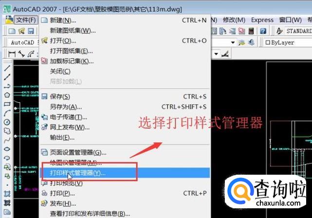 首先点击文件菜单,选择下拉菜单中的打印样式管理器选项,如下图所示