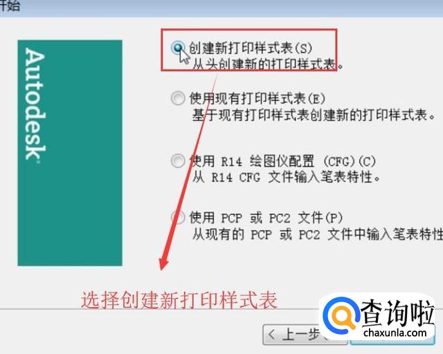 然后在打印样式表创建类型界面中我们选择创建新打印样式表,如下图所示