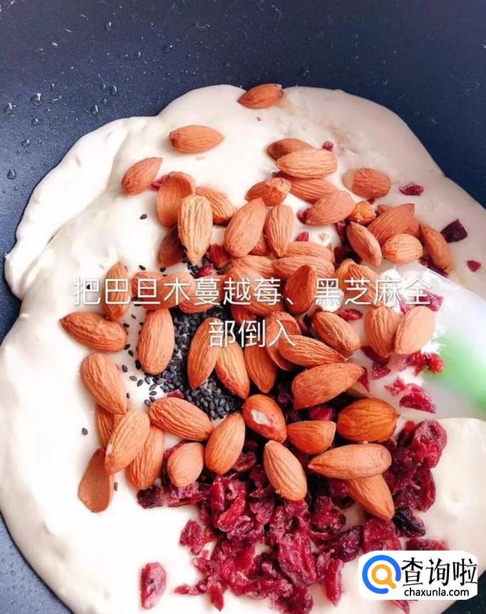 接着往锅中加入巴坦木,蔓越莓和黑芝麻,翻拌均匀,如下图所示。