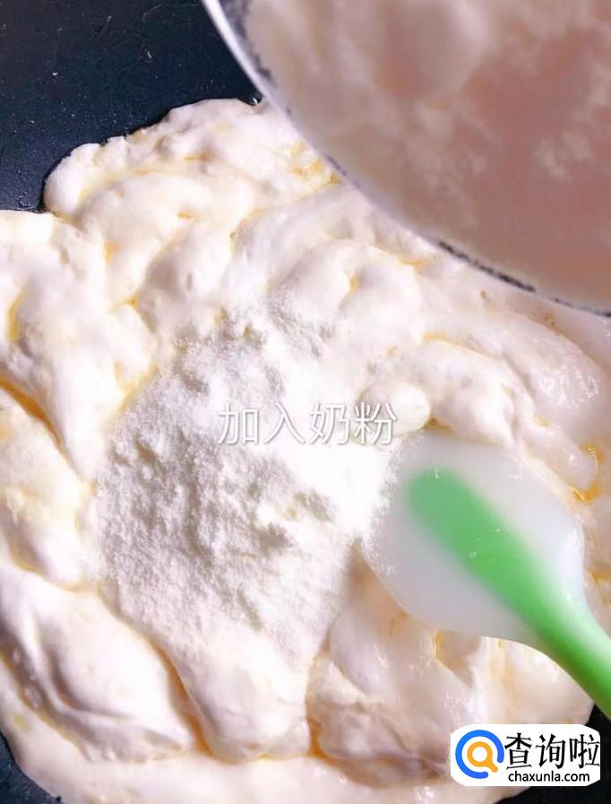接着往锅中加入奶粉,如下图所示。