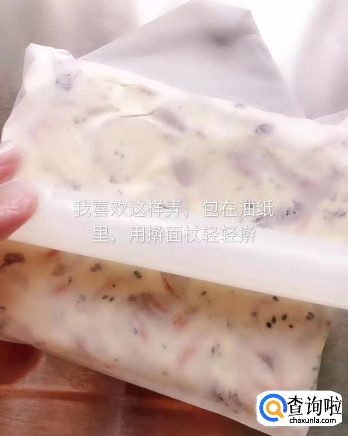 接着把所有的食材放到油纸里,用擀面杖擀平,如下图所示。