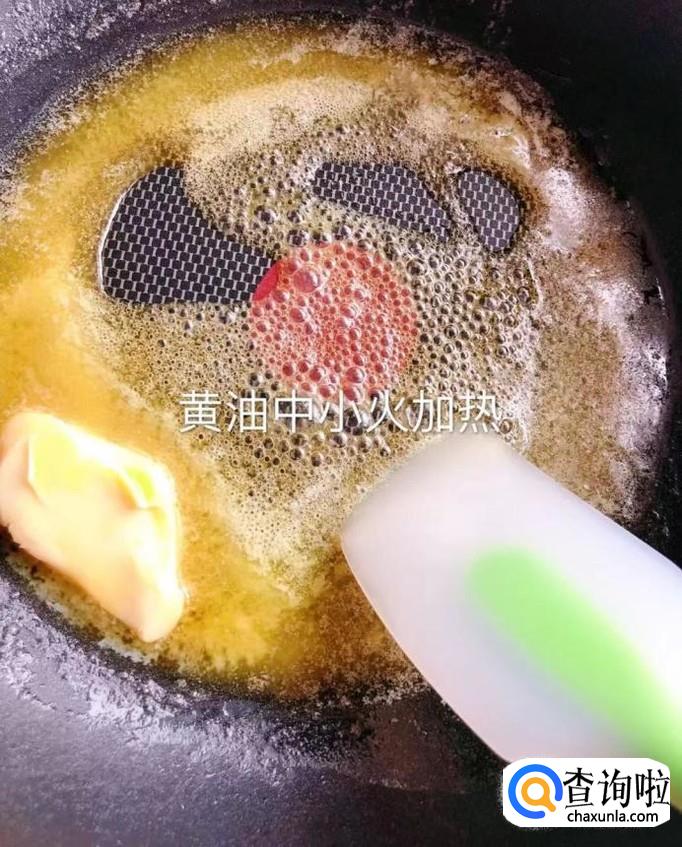 首先把黄油放入锅中,开小火加热至融化,如下图所示。