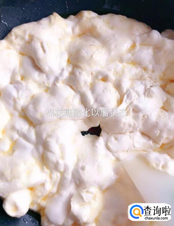 然后把棉花糖倒入锅中翻拌至融化,如下图所示。